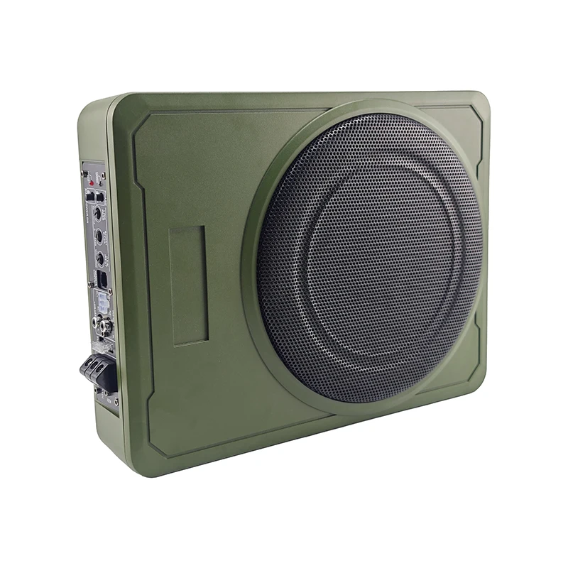 Amplificador ativo da caixa do subwoofer do subwoofer do assento de carro do painel verde de 10 polegadas, design fino de 150 watts rms
