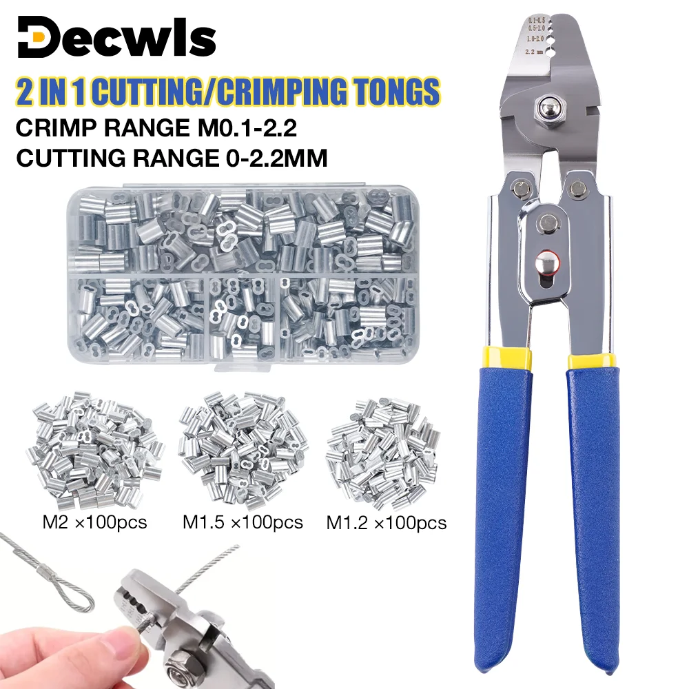 Alicate de crimpagem de manga de alumínio M0.1-2.2, cortador de cabo de aço 2 em 1 de 0-2,2 mm, alicate manual doméstico de 10 polegadas, ferramenta de crimpagem de cabo de aço, com 300 mangas de alumínio