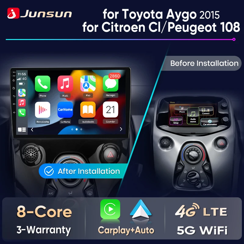 Junsun android auto rádio do carro para toyota aygo 2015 para citroen c1 2020 peugeo 108 multimídia sem fio carplay swc gps dab navi