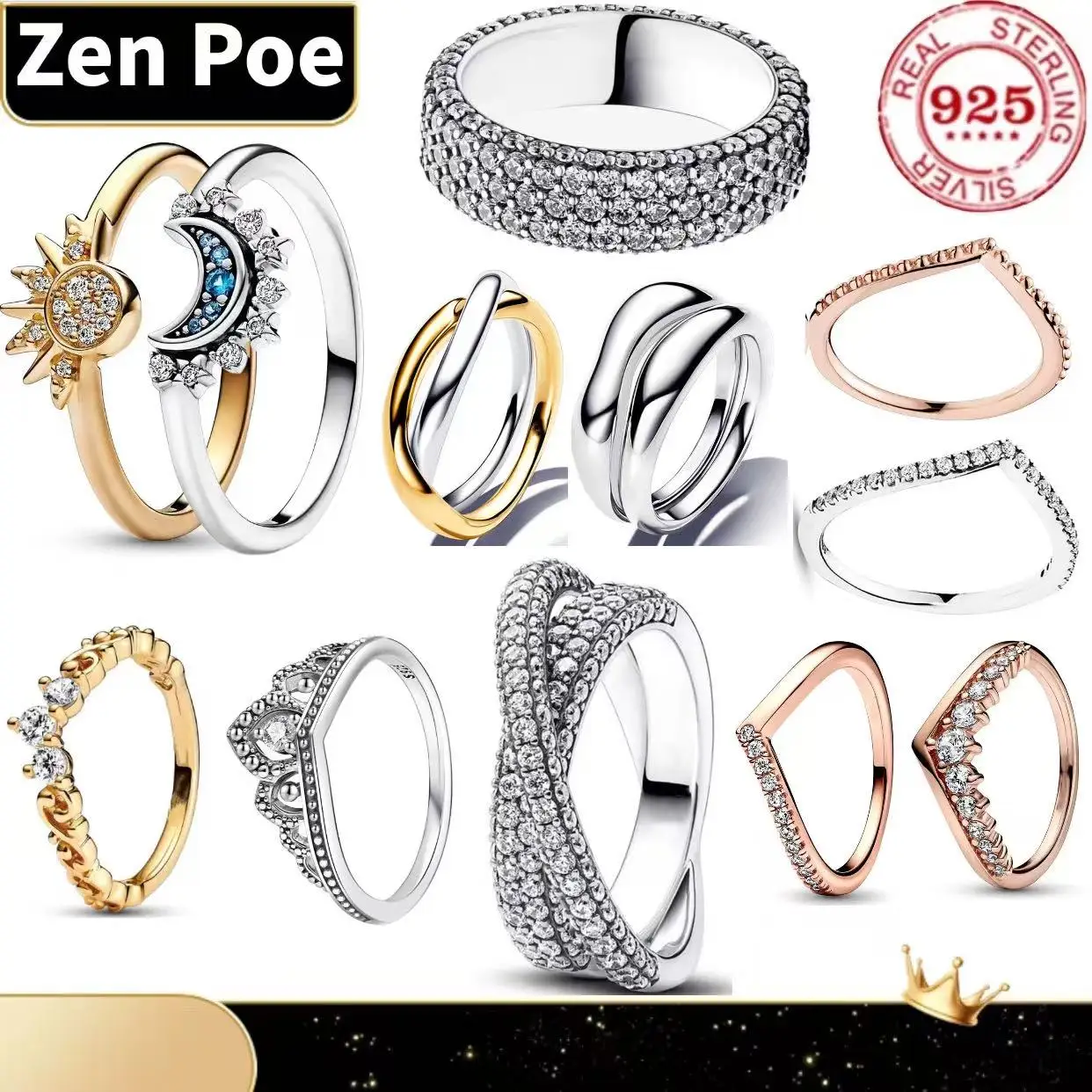 Anéis de prata esterlina 925 com coroa de sol e lua, brilhantes, para mulheres, presentes de aniversário, joias de luxo
