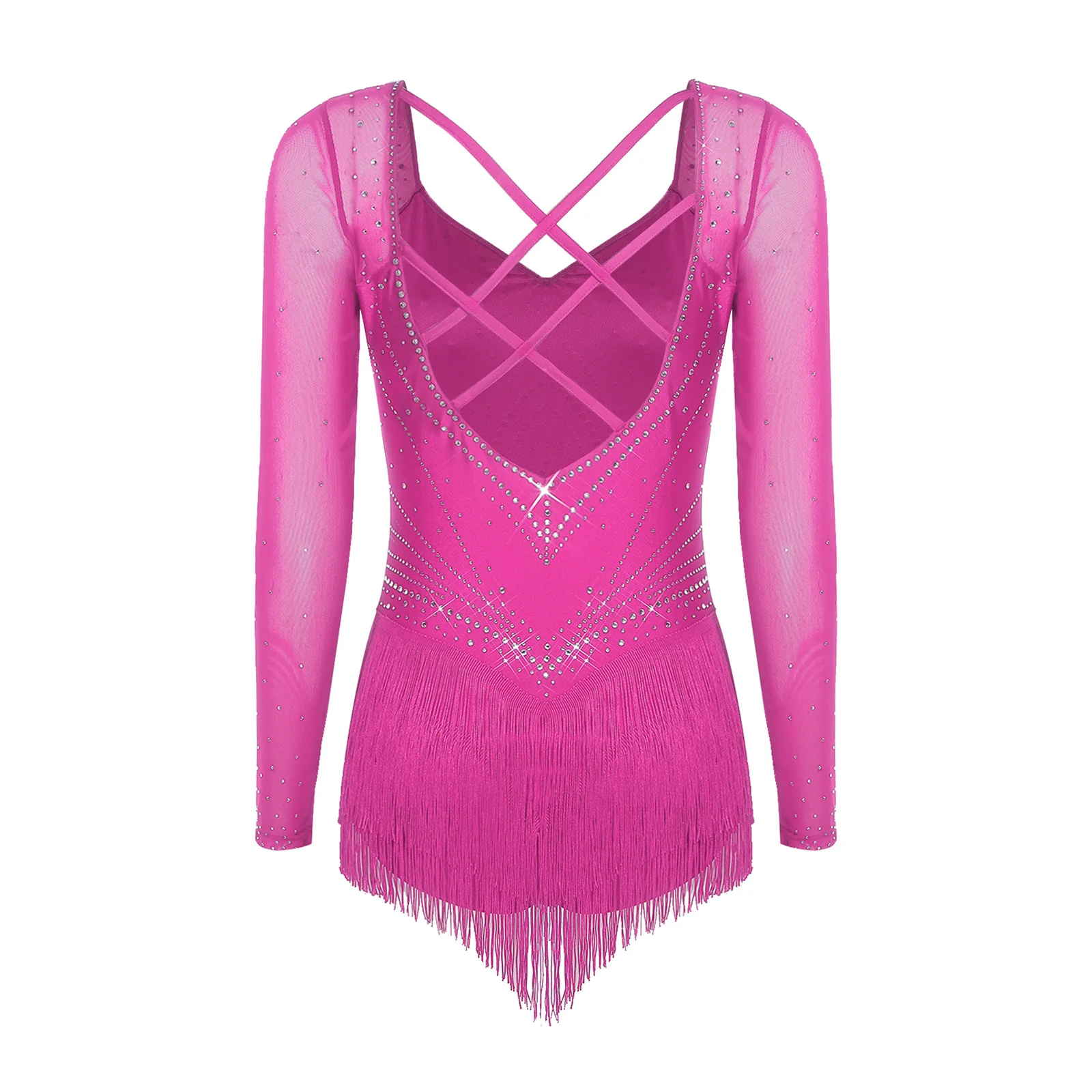 Macacão Feminino com Decote V Profundo e Alças, Traje de Dança Latina, Body de Lantejoulas Brilhantes, Macacão com Franjas para Dança Country, Roupa de Balada Disco
