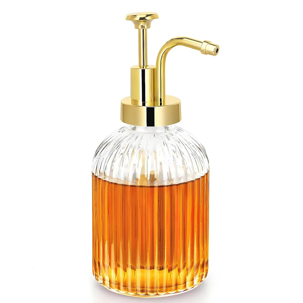 Dispensador de Xarope de Vidro 10oz, Garrafas de Xarope com Design Canelado, Bomba Dourada para Xarope, Acessórios para Bar de Café, Dispensador de Mel
