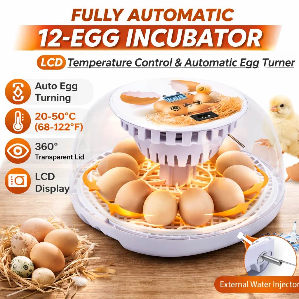 Incubadora Automática de Ovos com Capacidade para 12 Ovos, Controle de Temperatura LCD, Incubadora para Galinhas, Patos e Codornas, Plugue EU para Uso Doméstico