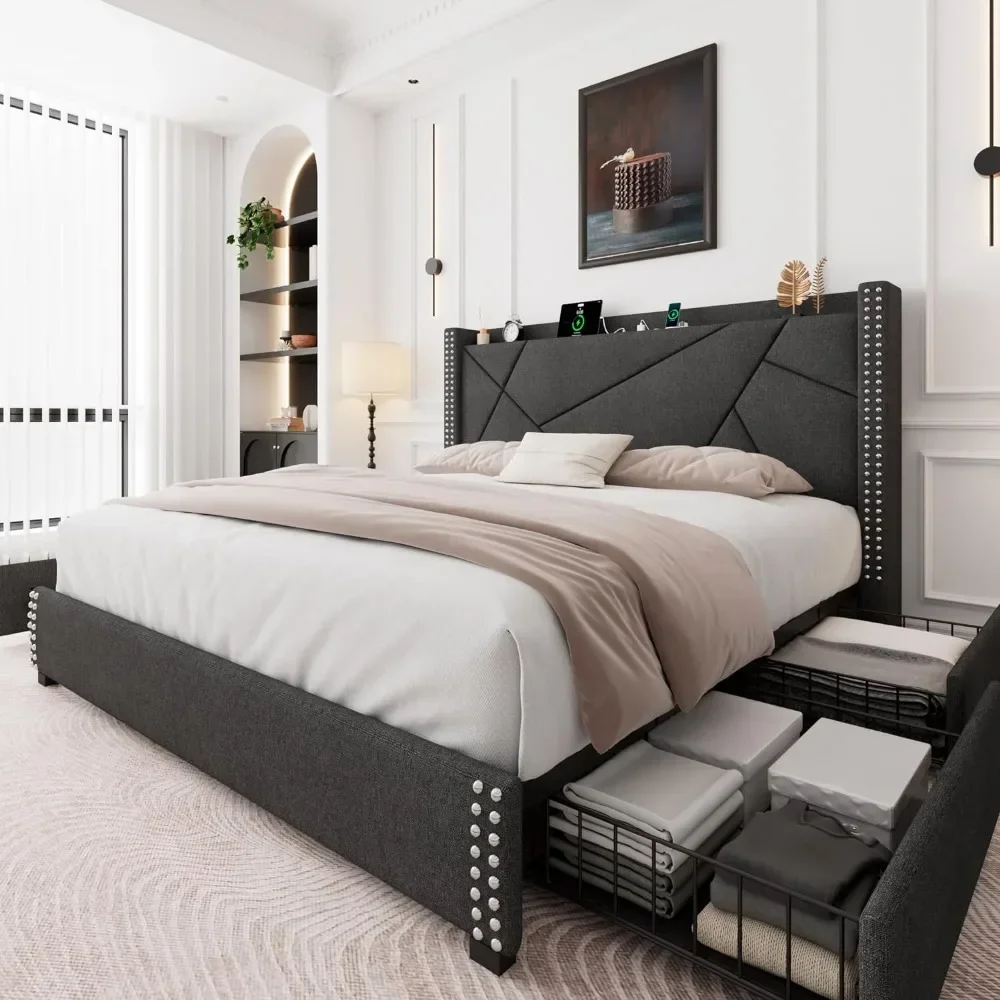 Estrutura de cama queen com 4 gavetas de armazenamento Estrutura de cama de plataforma estofada com estação de carregamento e prateleira traseira,