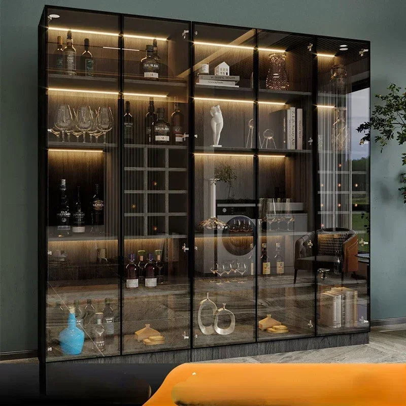 Armário de vinho grande prático com porta de vidro, armário de exibição de luxo leve contra a parede, aparador de madeira maciça, li integrado