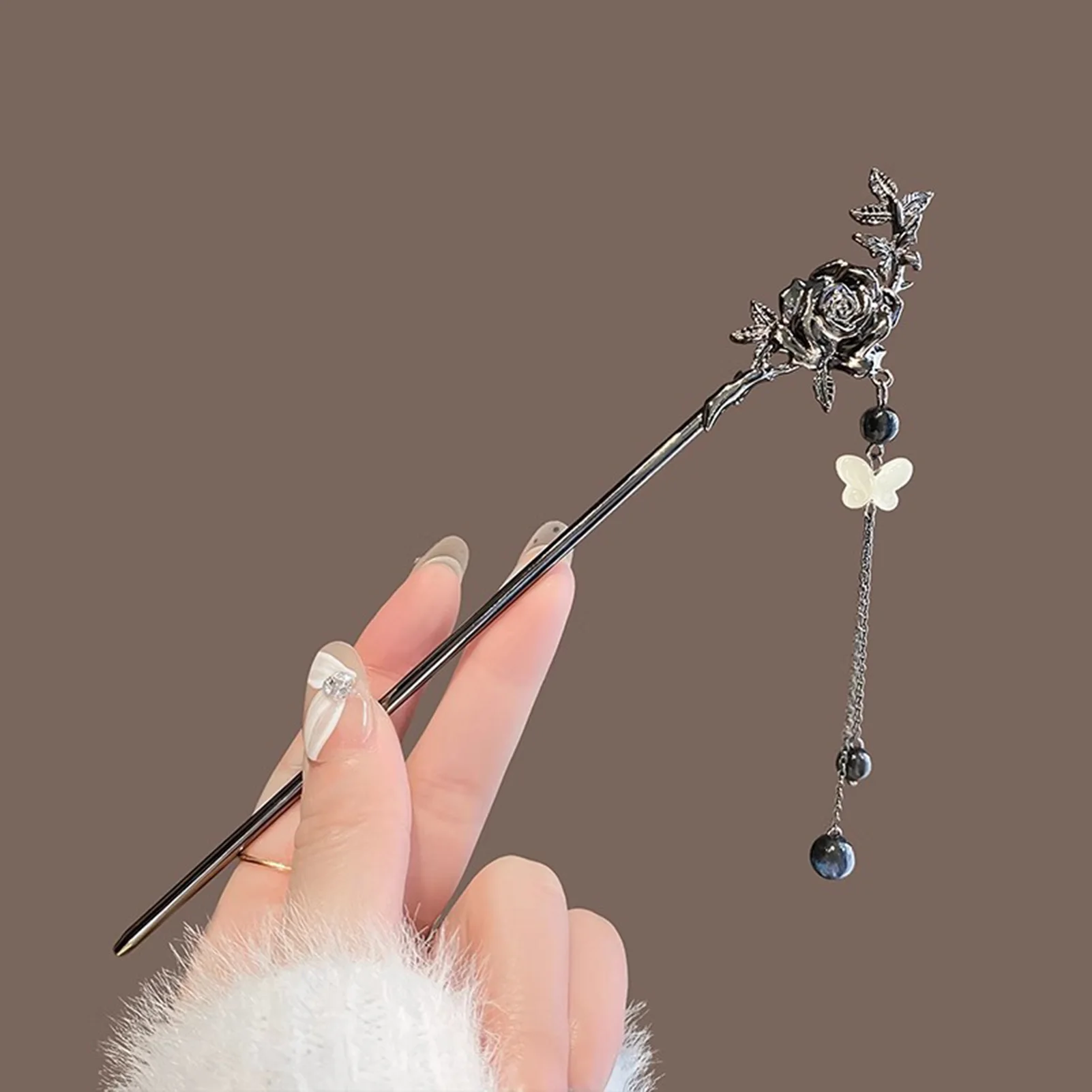 Novos Acessórios de Cabelo em Estilo Chinês: Grampos de Cabelo em Liga com Designs de Rosas, Alfinetes de Cabelo com Contas/Pingente de Borboleta, Joias Decorativas para Cabelo