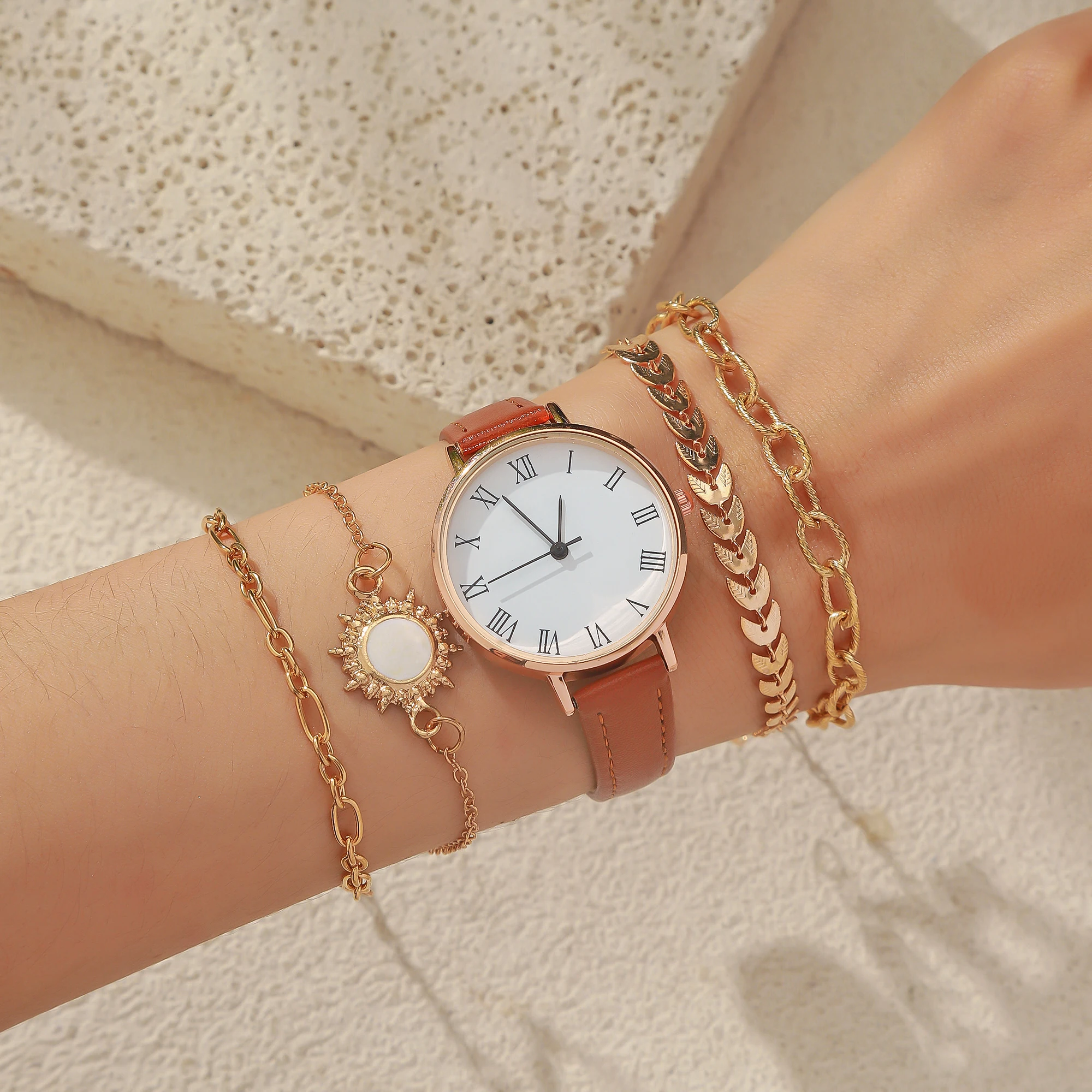 5 шт./компл., новый простой универсальный женский кожаный ремень, кварцевые часы, браслет, набор из пяти предметов, подходит для подарков на день рождения