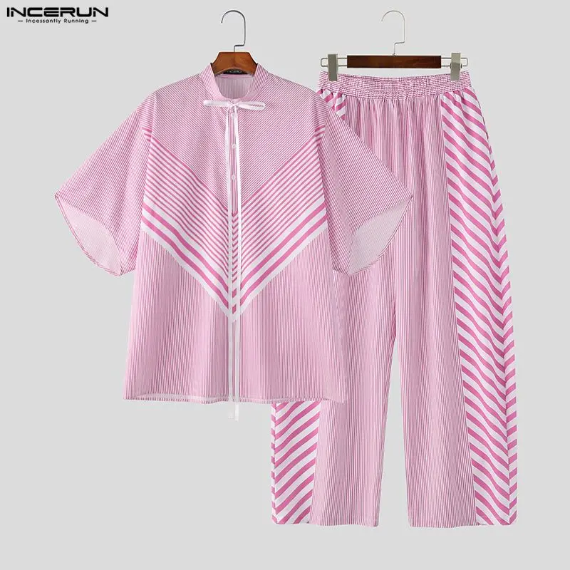 Мужской комплект INCERUN: полосатая рубашка с коротким рукавом на шнуровке и брюки, комплект из двух предметов, уличная мода, свободный крой, 2026, модные мужские костюмы
