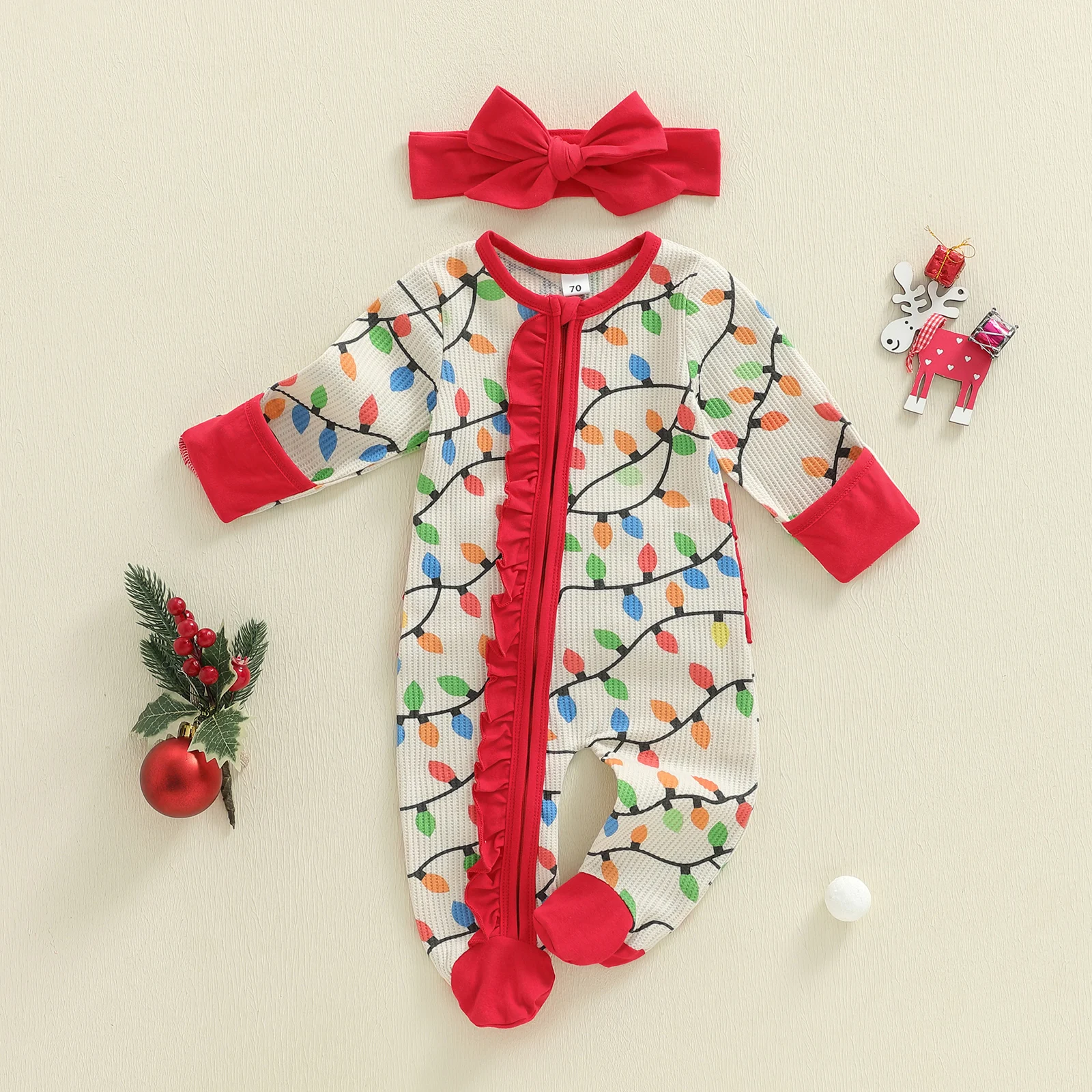 Рождественский комбинезон для новорожденных девочек с подсветкой и принтом на шнуровке, комбинезон на молнии с длинными рукавами и круглым вырезом на ножках с повязкой на голову