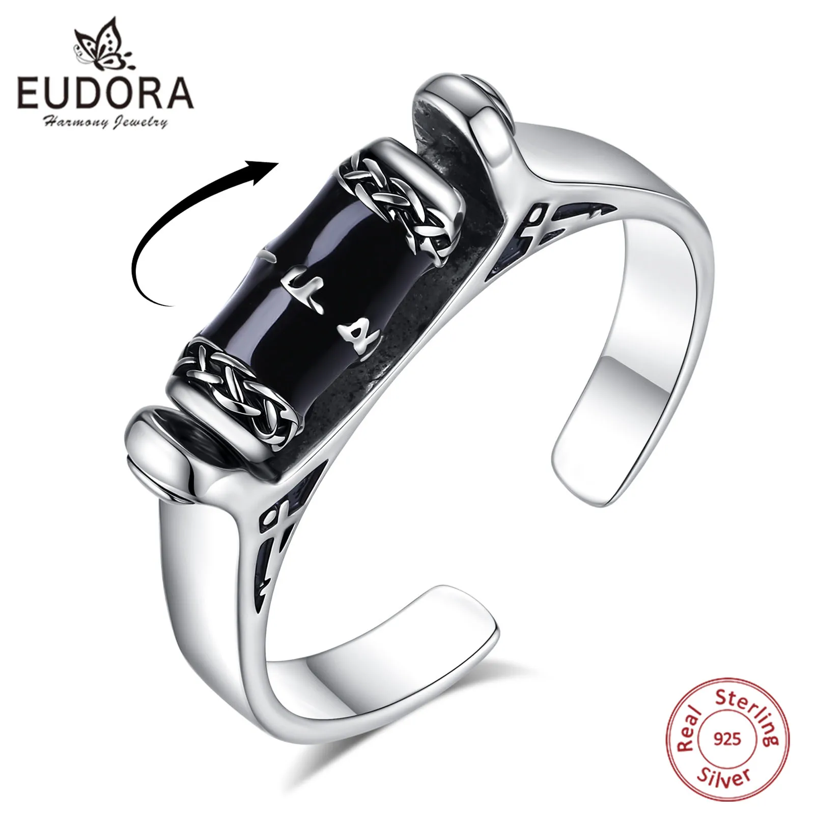 Кольцо Eudora из стерлингового серебра 925 пробы с рунами викингов, обсидианом и вращающимся элементом, регулируемое, антистрессовое, для медитации, подарок для мужчин