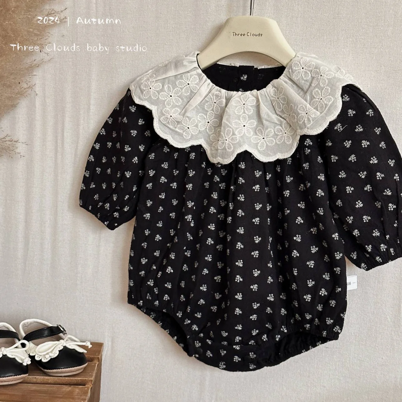 Детские боди, новый осенний стиль, черный комбинезон с длинными рукавами и цветочным принтом для маленьких девочек, новый стильный боди с детским воротником, японское кружево